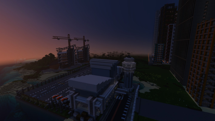 A construction zone was replaced by a building next to the sea.